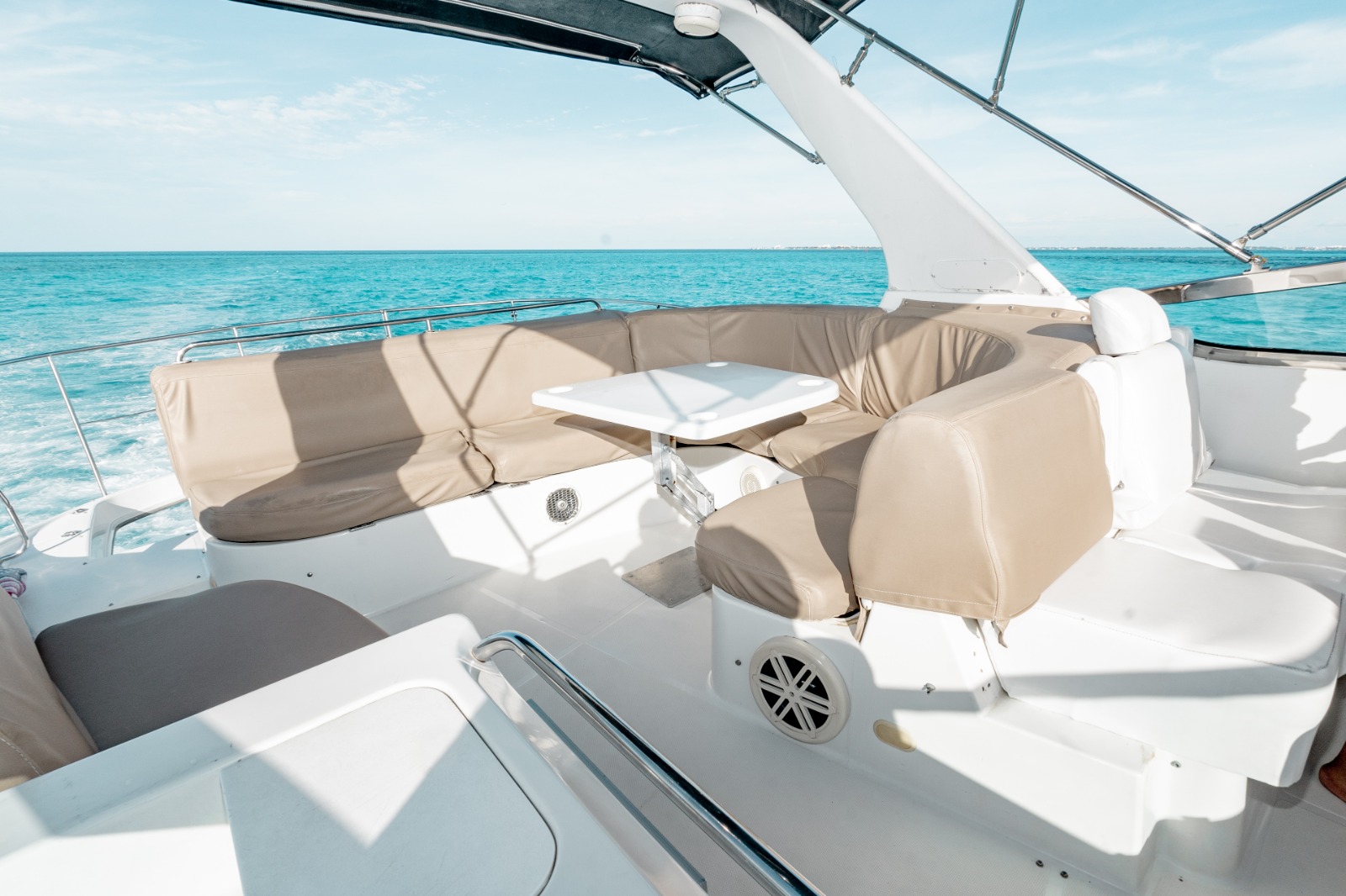 – Large cockpit with table, chairs, and access to the swim platform
